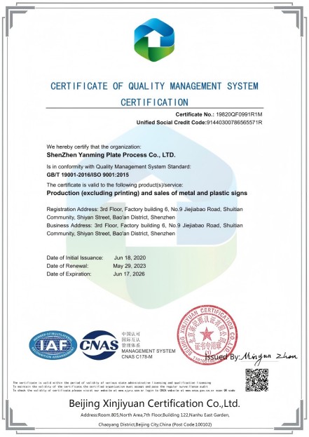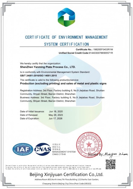2024.01.01 -Shenzhen Yanming Signage Technology Co., Ltd., zehaztasun fabrikatzaile nagusiaevchingTxinan produktuek ofizialki lortu dute ISO Ziurtagiria eta RoHS Betetze Ziurtagiria, bere posizioa bezero globalen bazkide fidagarri gisa indartuz, hala nola elektronika, gailu medikoak eta industria seinaleztapena.